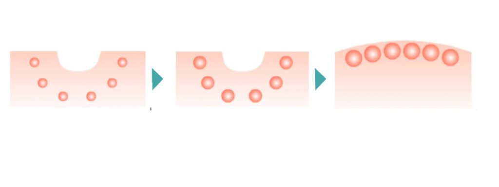 小さく濃縮された保湿成分が角質層に入り10分かけて大きくなります。