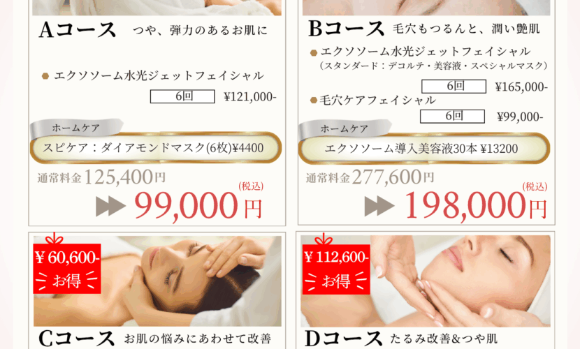 パーソナルダイヤモンドエステ(6回コース) エクソソーム水光ジェット(6回コース) 通常358,000円 → 298,000円(税込) ホームケア:約83,600円相当 (美容液・洗顔・化粧水・クリーム・エッセンス) 肌質や年齢に合わせたオーダーメイドケアで、ワンランク上の美肌へ導きます。◆Dコース|たるみ改善&つや肌集中リフトケア